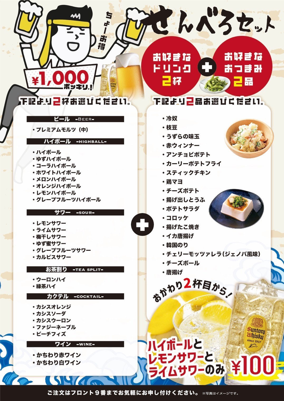 お好きなドリンク2杯とお好きなおつまみ2品のせんべろセット!ちょーお得♪